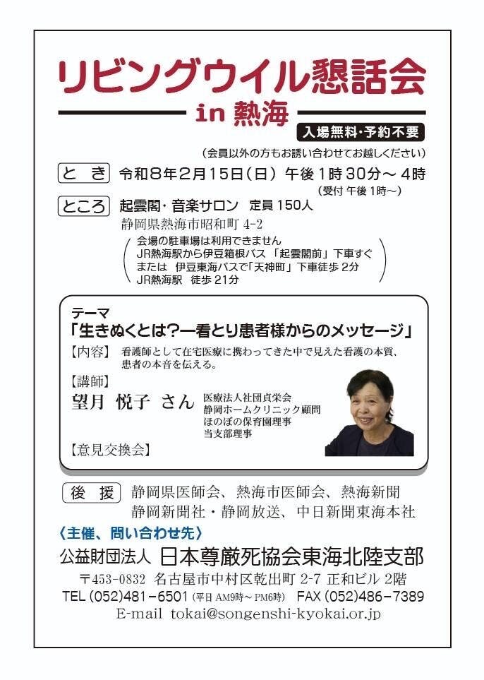 令和8年2月15日(日)、公益財団法人日本尊厳死協会東海・北陸支部主催の「リビングウイル懇話会」が熱海にて開催されます。
