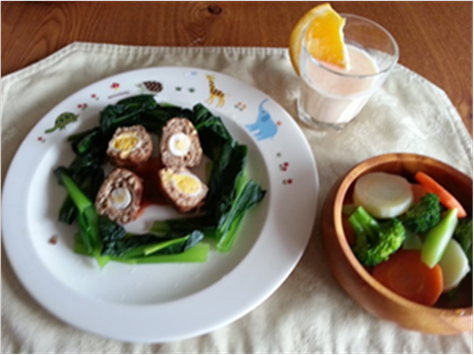 ・スコッチエッグの種に通常は炒めた玉ねぎを入れますが、代わりにすりおろしにんじんを入れます。(にんじんはフードプロセッサーで細かくしてもOK)柔らかめに仕上がります。