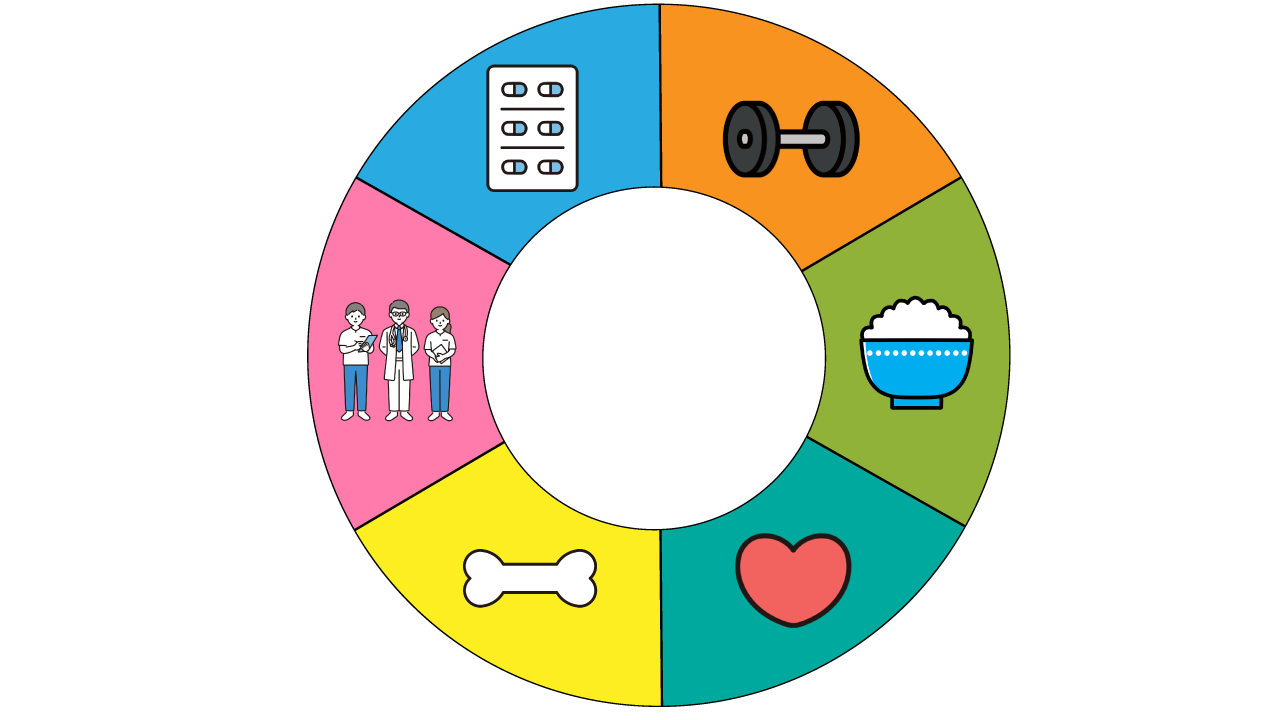 抗炎症作用のある食品の摂取、適正体重の維持、骨を強くする栄養素の補給など、食事面からサポートします。